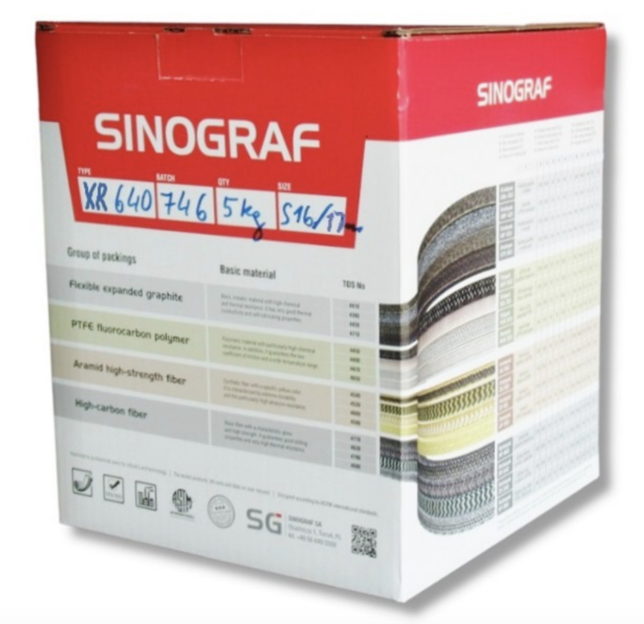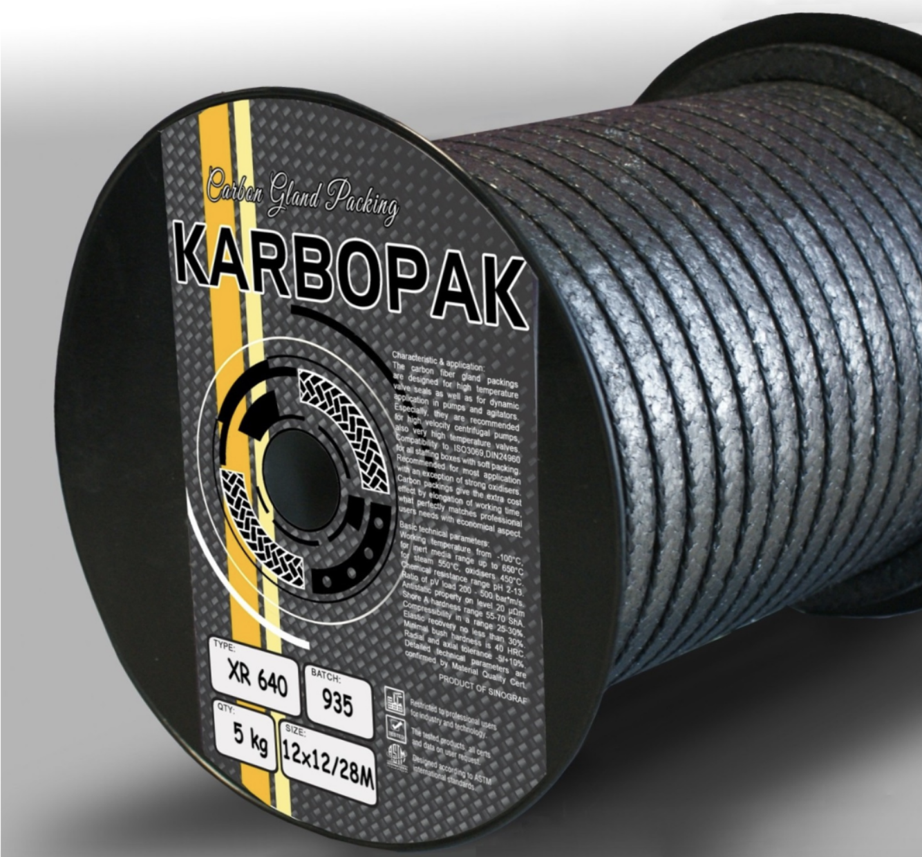De XR 640 pakking is gemaakt van geëxpandeerd grafiet en high modulus koolstofvezel C98 met toevoeging van corrosie-inhibitoren en lichte PTFE impregnatie, wat zorgt voor dichtheid bij lagere klier druk. De vlecht is gemaakt in de vorm van versterkte hoeken, wat de mechanische sterkte van de afdichting aanzienlijk beïnvloedt, met behoud van uitstekende glijeigenschappen van grafiet.